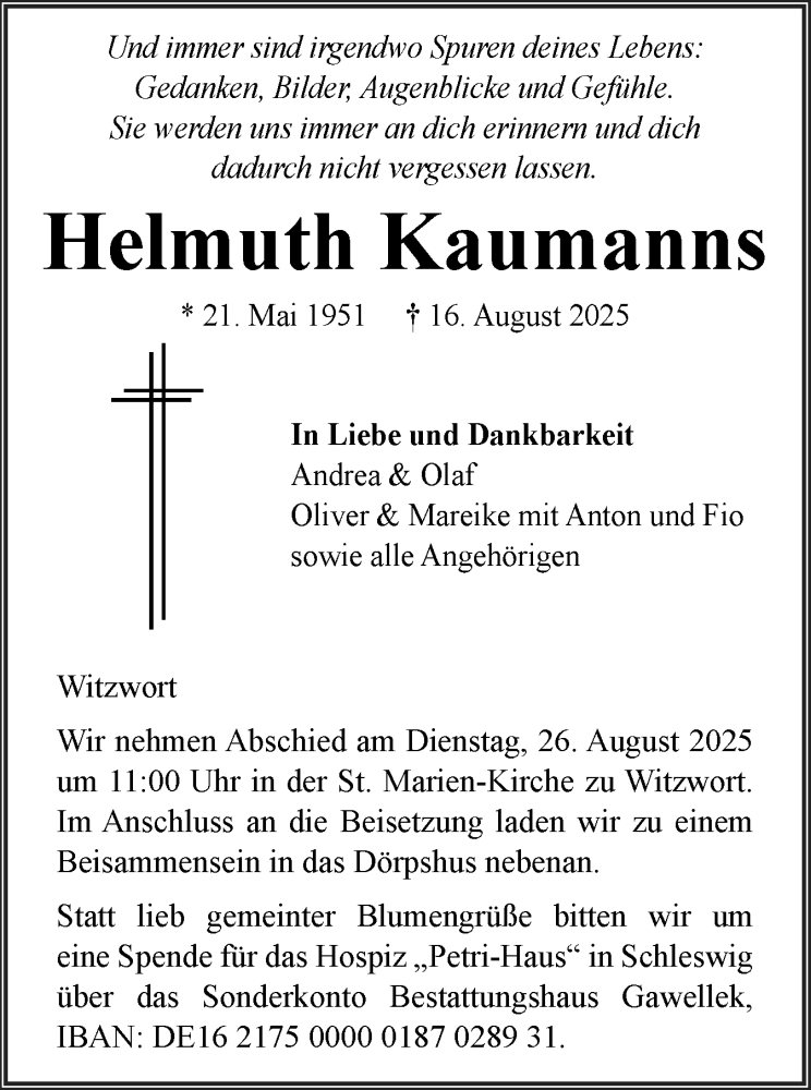 Hier finden Sie alle Traueranzeigen aus der Zeitung, die bisher für Helmuth Kaumanns erschienen sind. Weitere Traueranzeigen, die in der Zeitung erscheinen, werden hier ebenfalls aufgelistet