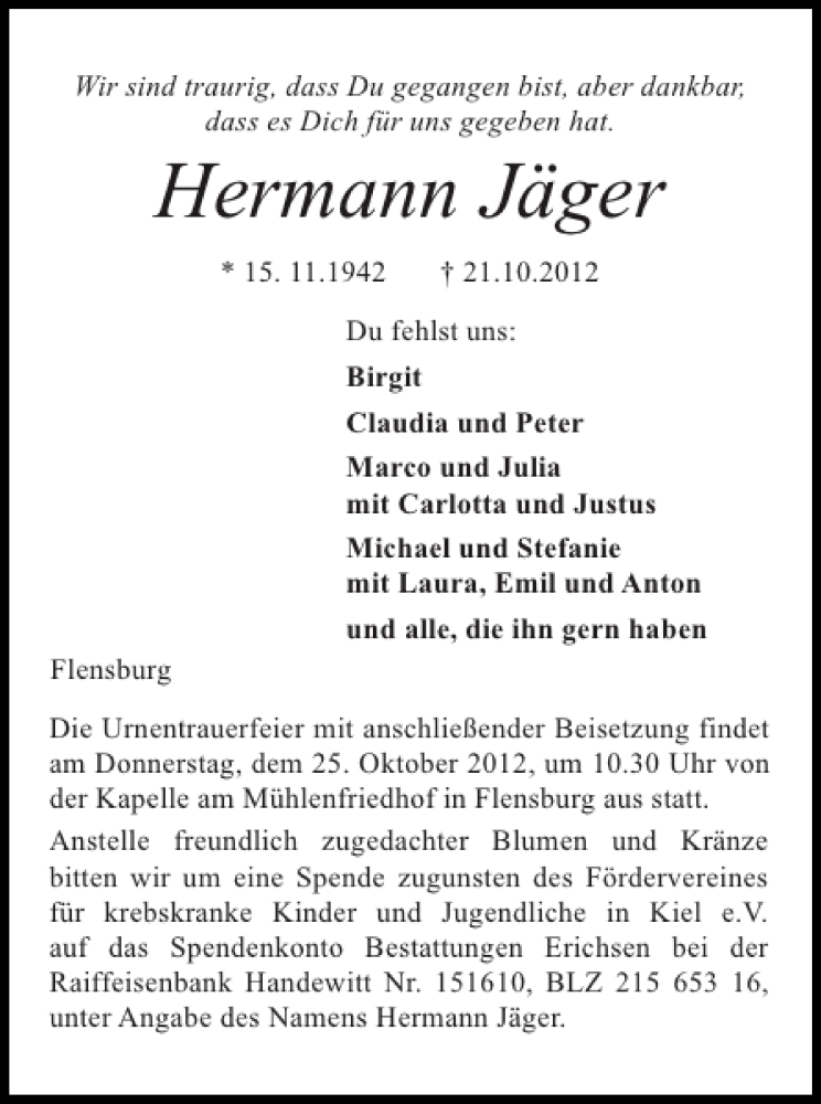Hier finden Sie alle Traueranzeigen aus der Zeitung, die bisher für Hermann Jäger erschienen sind. Weitere Traueranzeigen, die in der Zeitung erscheinen, werden hier ebenfalls aufgelistet
