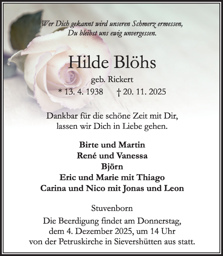 Hier finden Sie alle Traueranzeigen aus der Zeitung, die bisher für Hilde Blöhs erschienen sind. Weitere Traueranzeigen, die in der Zeitung erscheinen, werden hier ebenfalls aufgelistet