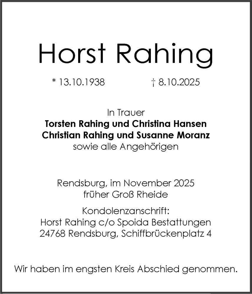 Hier finden Sie alle Traueranzeigen aus der Zeitung, die bisher für Horst Rahing erschienen sind. Weitere Traueranzeigen, die in der Zeitung erscheinen, werden hier ebenfalls aufgelistet