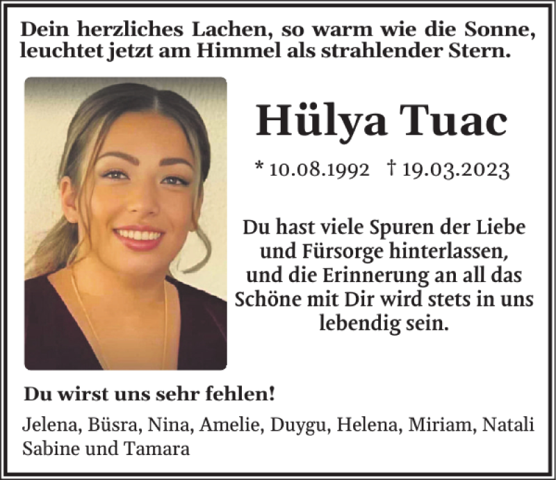 Hier finden Sie alle Traueranzeigen aus der Zeitung, die bisher für Hülya Tuac erschienen sind. Weitere Traueranzeigen, die in der Zeitung erscheinen, werden hier ebenfalls aufgelistet