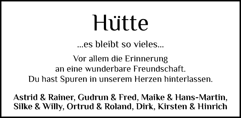 Hier finden Sie alle Traueranzeigen aus der Zeitung, die bisher für Hütte erschienen sind. Weitere Traueranzeigen, die in der Zeitung erscheinen, werden hier ebenfalls aufgelistet