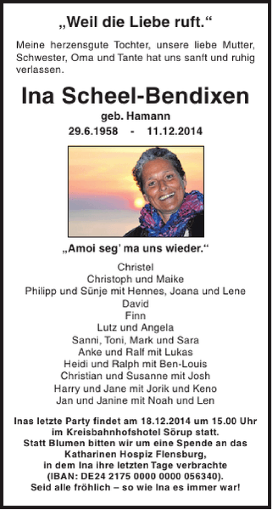 Hier finden Sie alle Traueranzeigen aus der Zeitung, die bisher für Ina Scheel-Bendixen erschienen sind. Weitere Traueranzeigen, die in der Zeitung erscheinen, werden hier ebenfalls aufgelistet