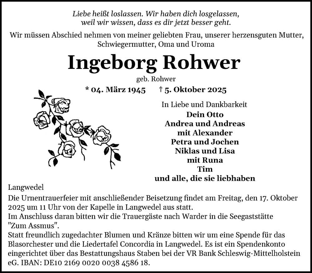 Hier finden Sie alle Traueranzeigen aus der Zeitung, die bisher für Ingeborg Rohwer erschienen sind. Weitere Traueranzeigen, die in der Zeitung erscheinen, werden hier ebenfalls aufgelistet