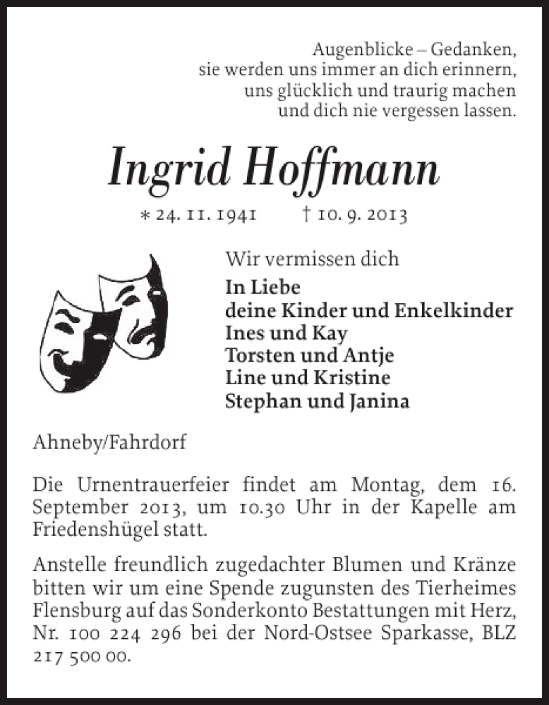 Hier finden Sie alle Traueranzeigen aus der Zeitung, die bisher für Ingrid Hoffmann erschienen sind. Weitere Traueranzeigen, die in der Zeitung erscheinen, werden hier ebenfalls aufgelistet
