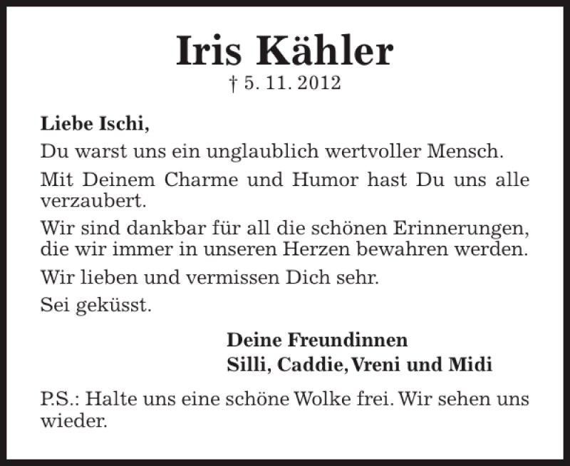 Hier finden Sie alle Traueranzeigen aus der Zeitung, die bisher für Iris Kähler erschienen sind. Weitere Traueranzeigen, die in der Zeitung erscheinen, werden hier ebenfalls aufgelistet