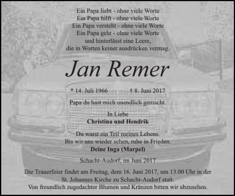 Hier finden Sie alle Traueranzeigen aus der Zeitung, die bisher für Jan Remer erschienen sind. Weitere Traueranzeigen, die in der Zeitung erscheinen, werden hier ebenfalls aufgelistet