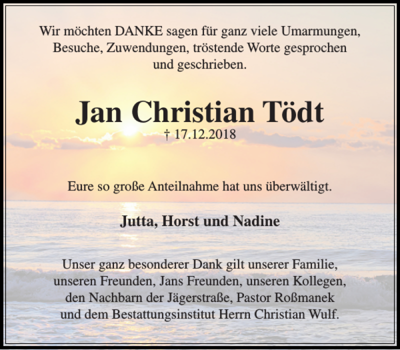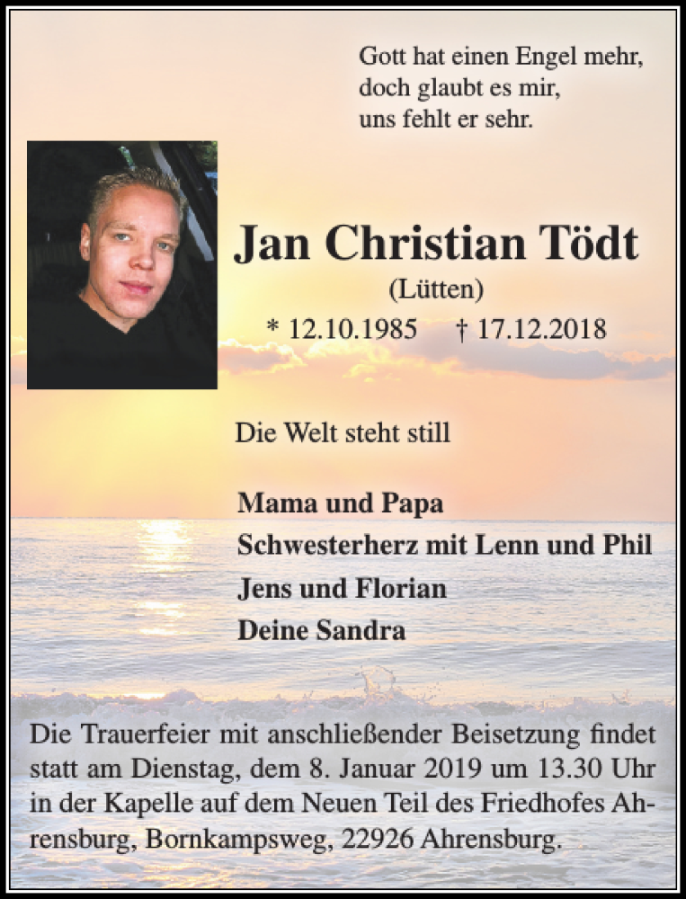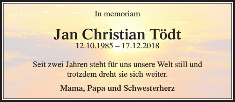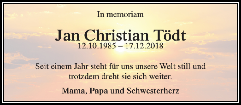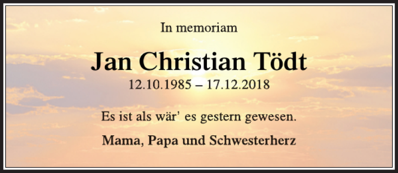 Hier finden Sie alle Traueranzeigen aus der Zeitung, die bisher für Jan Christian Tödt erschienen sind. Weitere Traueranzeigen, die in der Zeitung erscheinen, werden hier ebenfalls aufgelistet