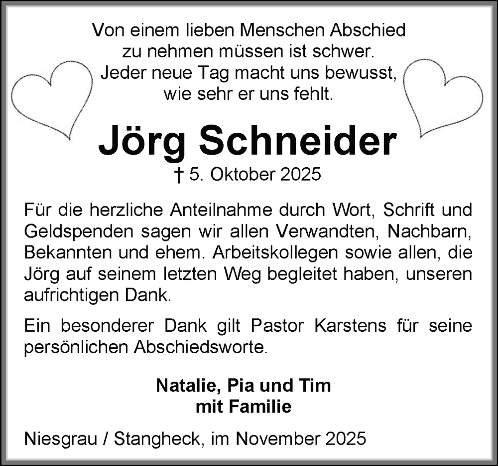 Hier finden Sie alle Traueranzeigen aus der Zeitung, die bisher für Jörg Schneider erschienen sind. Weitere Traueranzeigen, die in der Zeitung erscheinen, werden hier ebenfalls aufgelistet