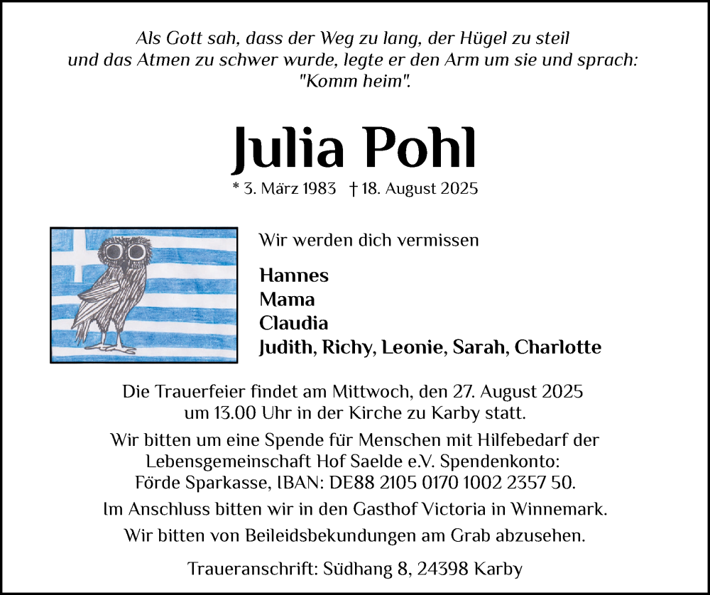 Hier finden Sie alle Traueranzeigen aus der Zeitung, die bisher für Julia Pohl erschienen sind. Weitere Traueranzeigen, die in der Zeitung erscheinen, werden hier ebenfalls aufgelistet
