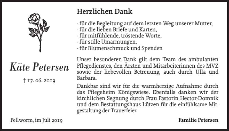 Hier finden Sie alle Traueranzeigen aus der Zeitung, die bisher für Käte Petersen erschienen sind. Weitere Traueranzeigen, die in der Zeitung erscheinen, werden hier ebenfalls aufgelistet
