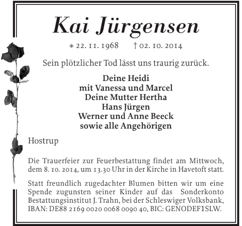 Hier finden Sie alle Traueranzeigen aus der Zeitung, die bisher für Kai Jürgensen erschienen sind. Weitere Traueranzeigen, die in der Zeitung erscheinen, werden hier ebenfalls aufgelistet