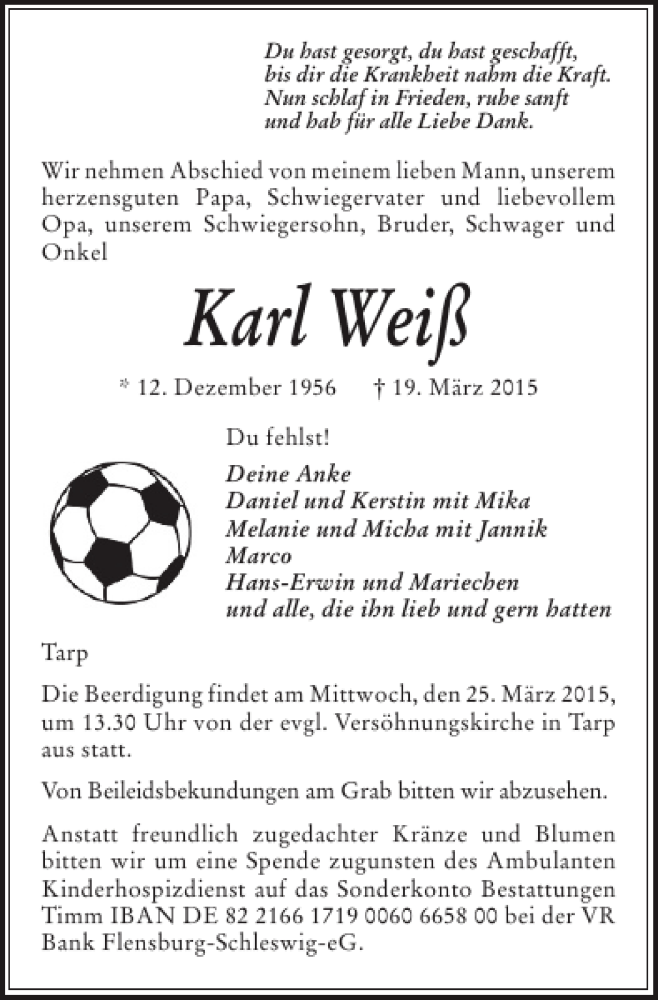 Hier finden Sie alle Traueranzeigen aus der Zeitung, die bisher für Karl Weiß erschienen sind. Weitere Traueranzeigen, die in der Zeitung erscheinen, werden hier ebenfalls aufgelistet