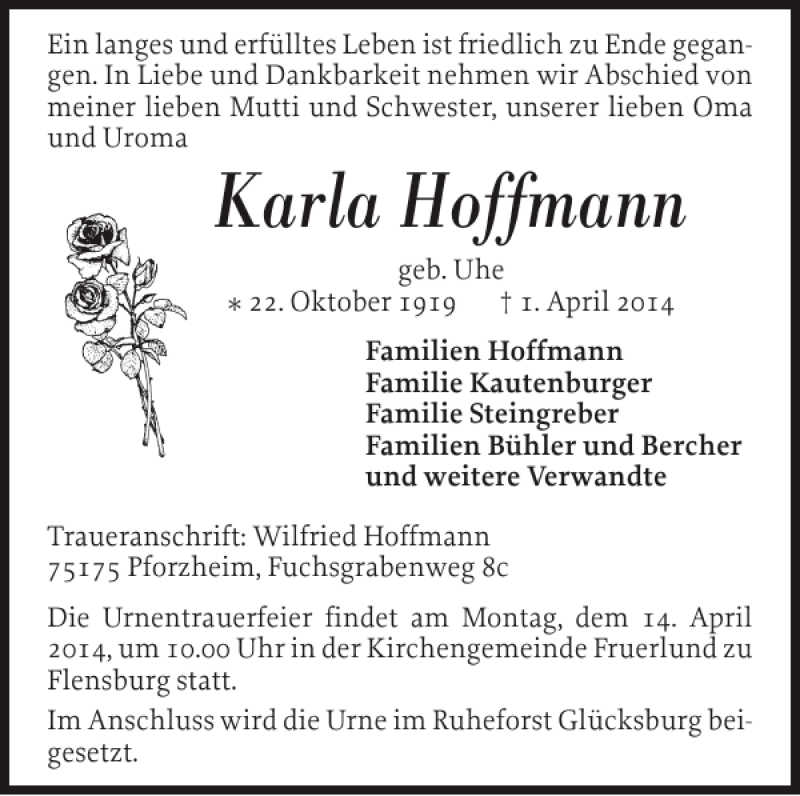 Hier finden Sie alle Traueranzeigen aus der Zeitung, die bisher für Karla Hoffmann erschienen sind. Weitere Traueranzeigen, die in der Zeitung erscheinen, werden hier ebenfalls aufgelistet
