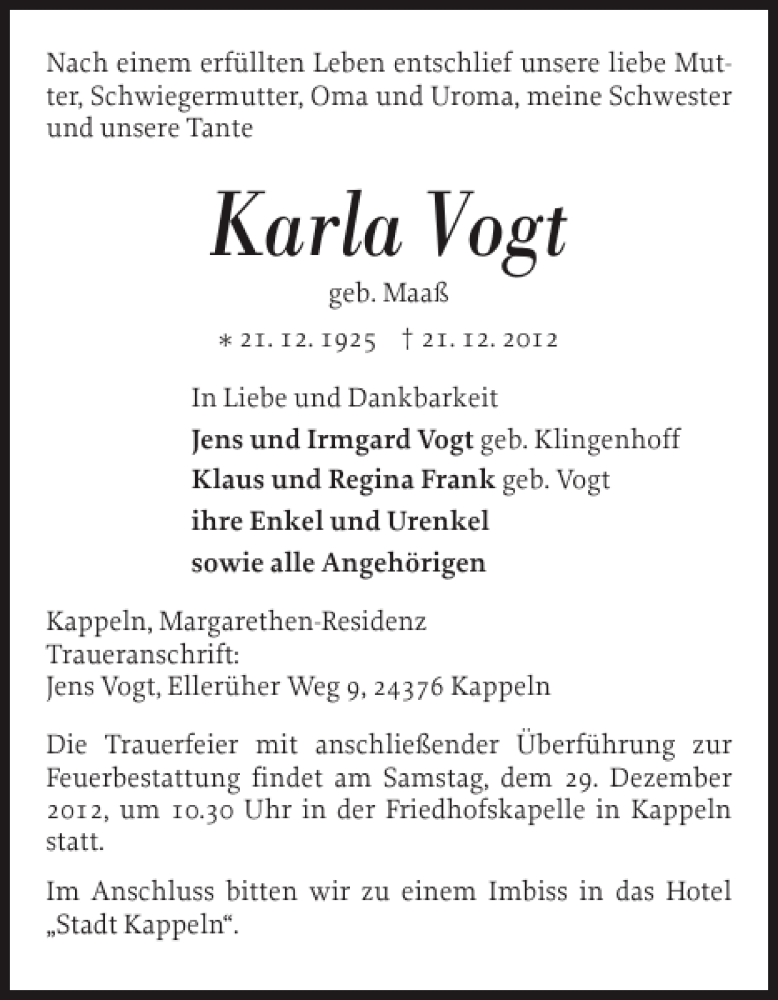 Hier finden Sie alle Traueranzeigen aus der Zeitung, die bisher für Karla Vogt erschienen sind. Weitere Traueranzeigen, die in der Zeitung erscheinen, werden hier ebenfalls aufgelistet