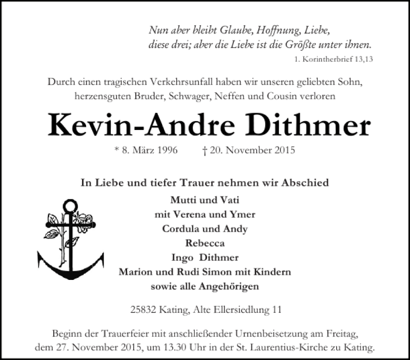 Hier finden Sie alle Traueranzeigen aus der Zeitung, die bisher für Kevin-Andre Dithmer erschienen sind. Weitere Traueranzeigen, die in der Zeitung erscheinen, werden hier ebenfalls aufgelistet