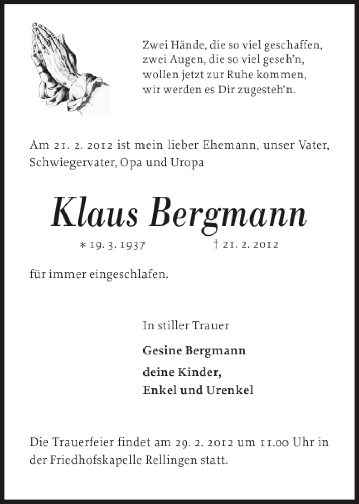 Hier finden Sie alle Traueranzeigen aus der Zeitung, die bisher für Klaus Bergmann erschienen sind. Weitere Traueranzeigen, die in der Zeitung erscheinen, werden hier ebenfalls aufgelistet