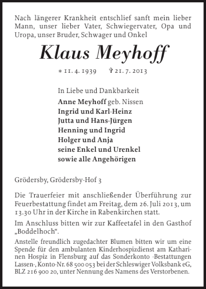 Hier finden Sie alle Traueranzeigen aus der Zeitung, die bisher für Klaus Meyhoff erschienen sind. Weitere Traueranzeigen, die in der Zeitung erscheinen, werden hier ebenfalls aufgelistet