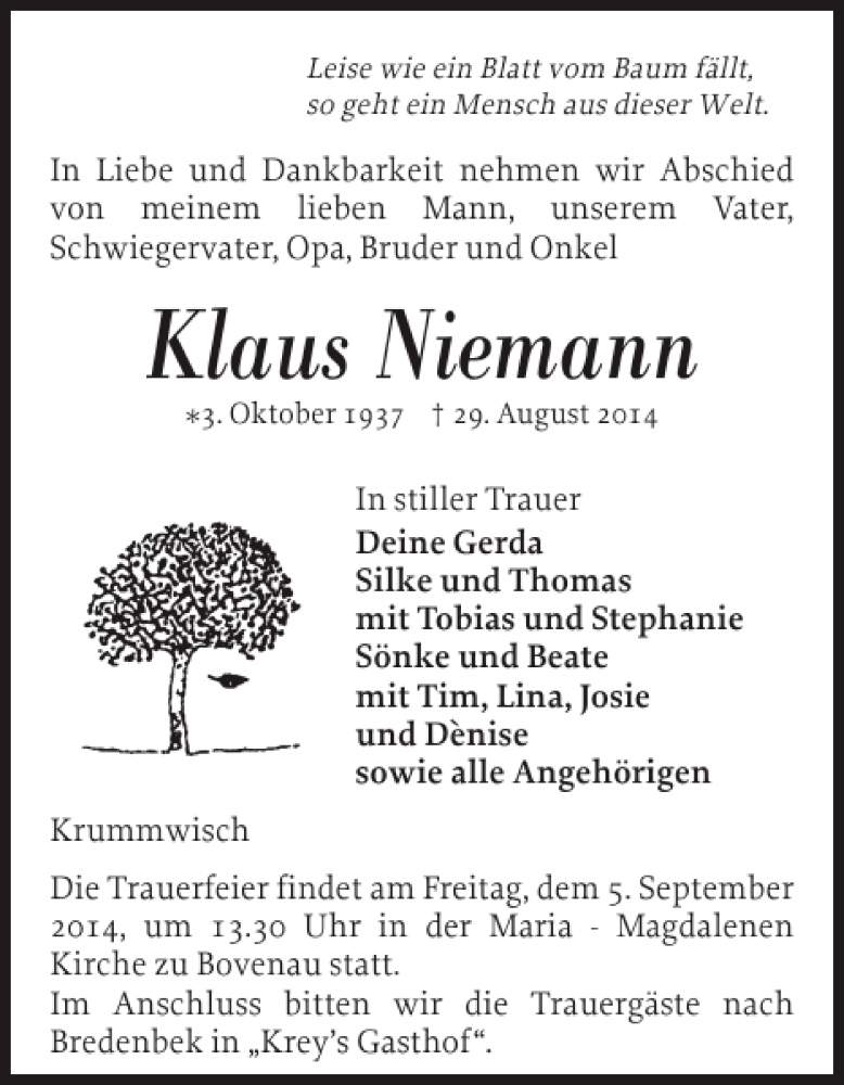 Hier finden Sie alle Traueranzeigen aus der Zeitung, die bisher für Klaus Niemann erschienen sind. Weitere Traueranzeigen, die in der Zeitung erscheinen, werden hier ebenfalls aufgelistet