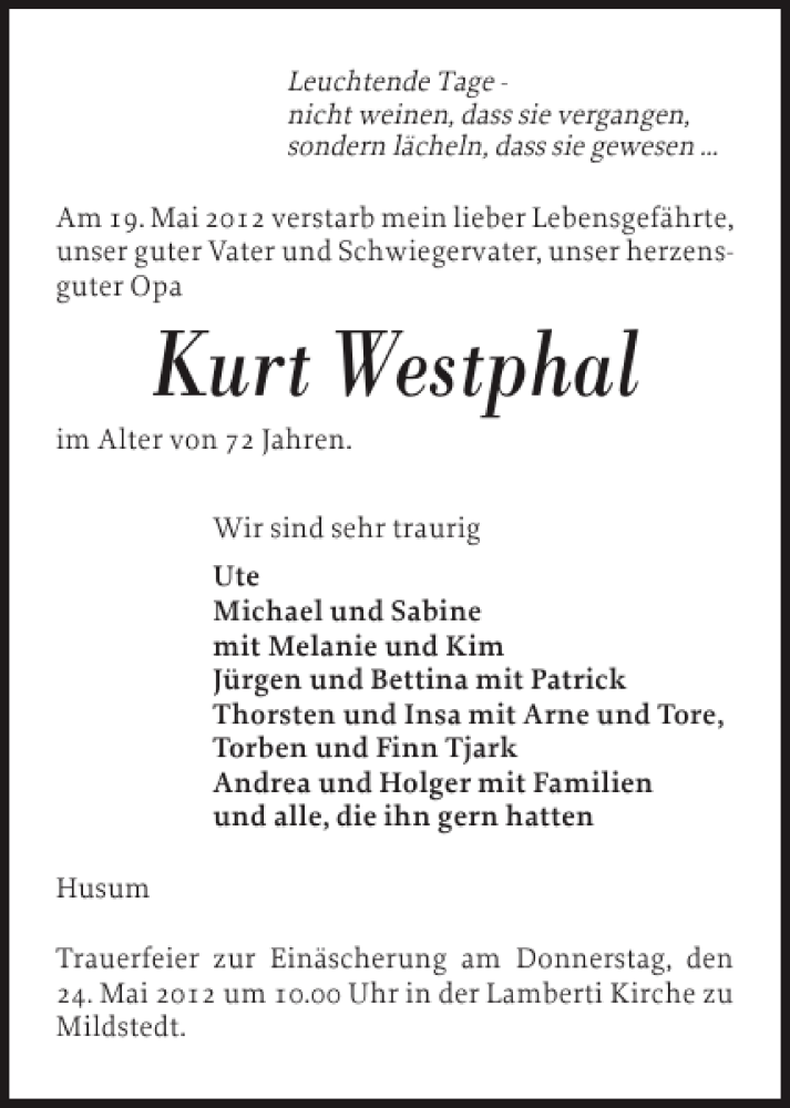 Hier finden Sie alle Traueranzeigen aus der Zeitung, die bisher für Kurt Westphal erschienen sind. Weitere Traueranzeigen, die in der Zeitung erscheinen, werden hier ebenfalls aufgelistet