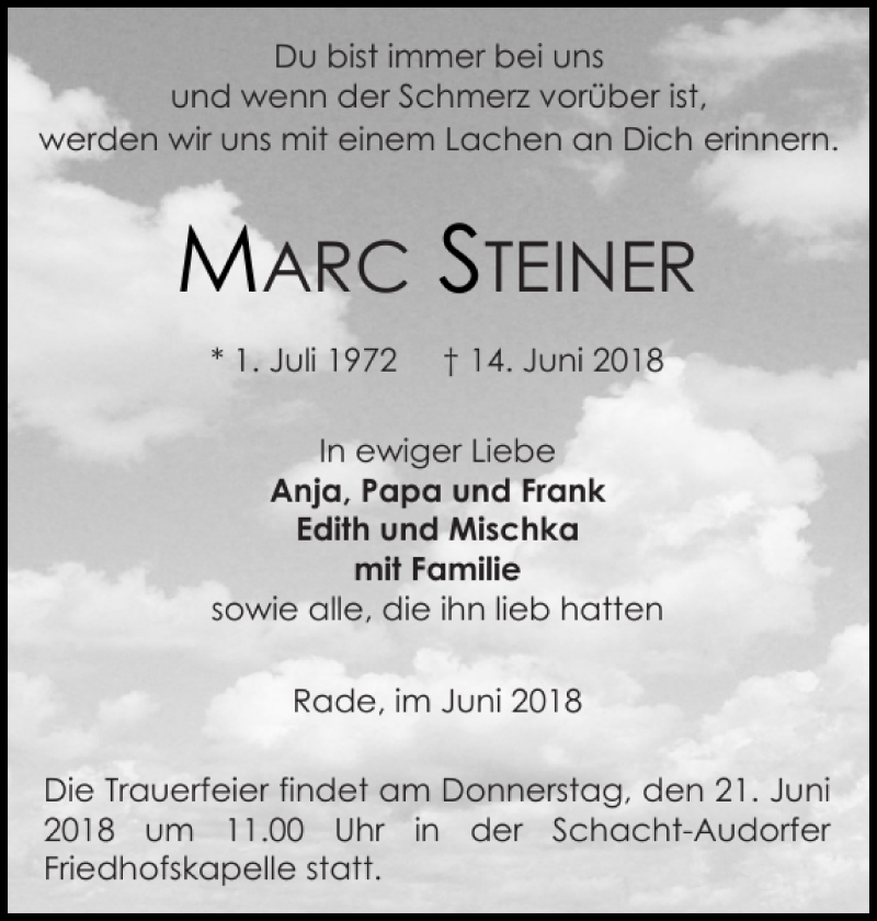 Hier finden Sie alle Traueranzeigen aus der Zeitung, die bisher für MARC STEINER erschienen sind. Weitere Traueranzeigen, die in der Zeitung erscheinen, werden hier ebenfalls aufgelistet