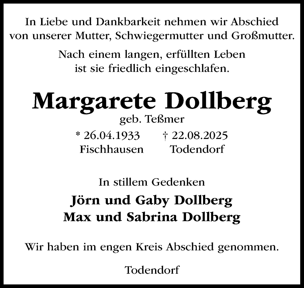 Hier finden Sie alle Traueranzeigen aus der Zeitung, die bisher für Margarete Dollberg erschienen sind. Weitere Traueranzeigen, die in der Zeitung erscheinen, werden hier ebenfalls aufgelistet