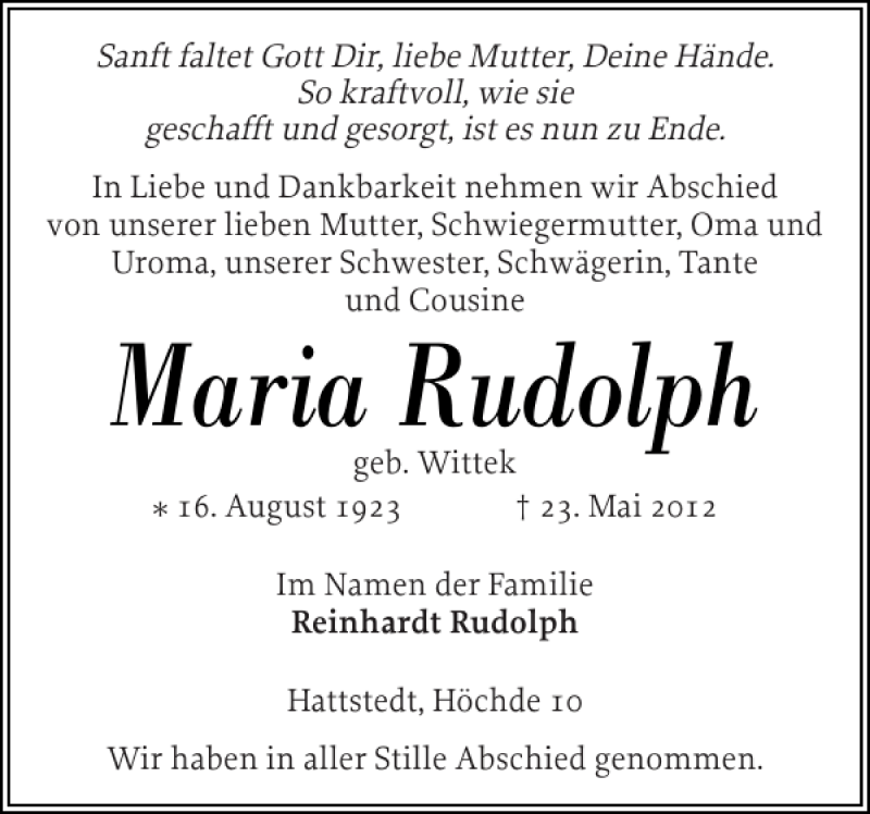 Hier finden Sie alle Traueranzeigen aus der Zeitung, die bisher für Maria Rudolph erschienen sind. Weitere Traueranzeigen, die in der Zeitung erscheinen, werden hier ebenfalls aufgelistet