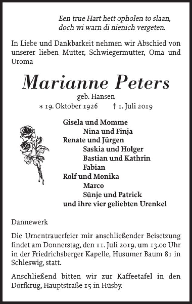 Hier finden Sie alle Traueranzeigen aus der Zeitung, die bisher für Marianne Peters erschienen sind. Weitere Traueranzeigen, die in der Zeitung erscheinen, werden hier ebenfalls aufgelistet
