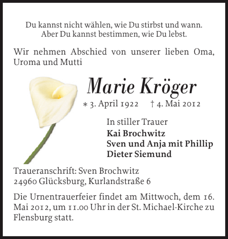 Hier finden Sie alle Traueranzeigen aus der Zeitung, die bisher für Marie Kröger erschienen sind. Weitere Traueranzeigen, die in der Zeitung erscheinen, werden hier ebenfalls aufgelistet