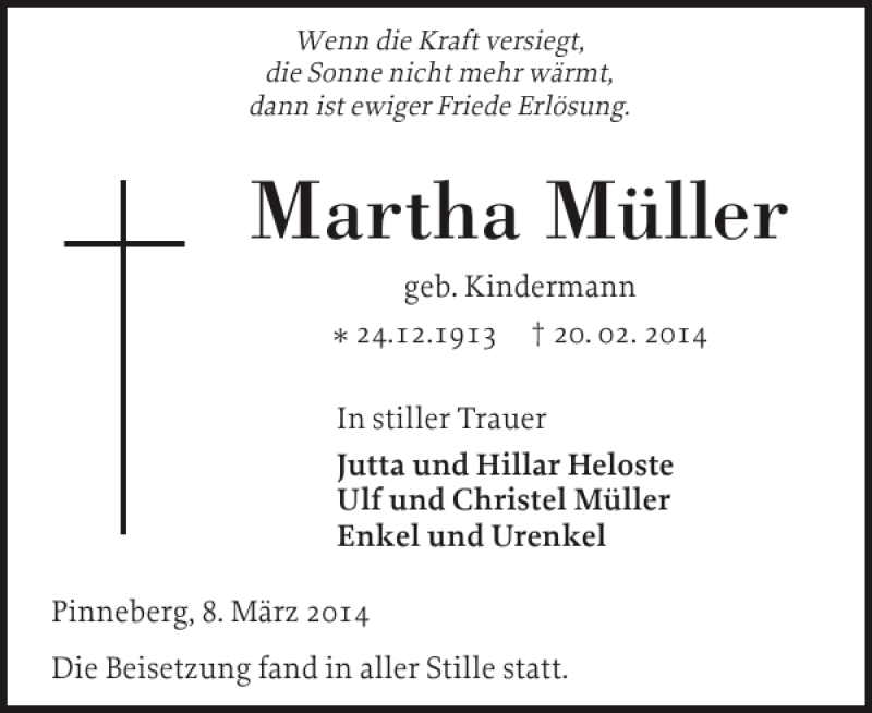 Hier finden Sie alle Traueranzeigen aus der Zeitung, die bisher für Martha Müller erschienen sind. Weitere Traueranzeigen, die in der Zeitung erscheinen, werden hier ebenfalls aufgelistet