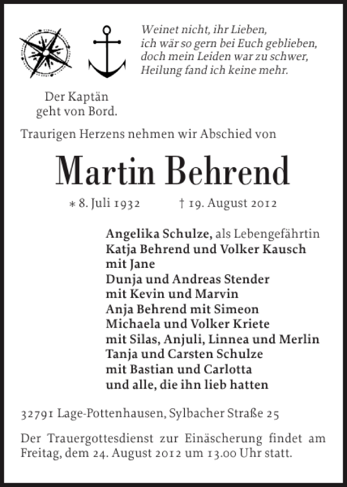 Hier finden Sie alle Traueranzeigen aus der Zeitung, die bisher für Martin Behrend erschienen sind. Weitere Traueranzeigen, die in der Zeitung erscheinen, werden hier ebenfalls aufgelistet