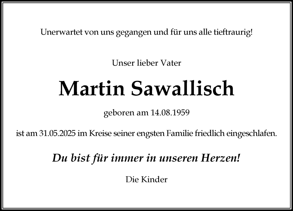 Hier finden Sie alle Traueranzeigen aus der Zeitung, die bisher für Martin Sawallisch erschienen sind. Weitere Traueranzeigen, die in der Zeitung erscheinen, werden hier ebenfalls aufgelistet