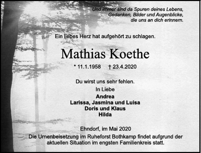 Hier finden Sie alle Traueranzeigen aus der Zeitung, die bisher für Mathias Koethe erschienen sind. Weitere Traueranzeigen, die in der Zeitung erscheinen, werden hier ebenfalls aufgelistet