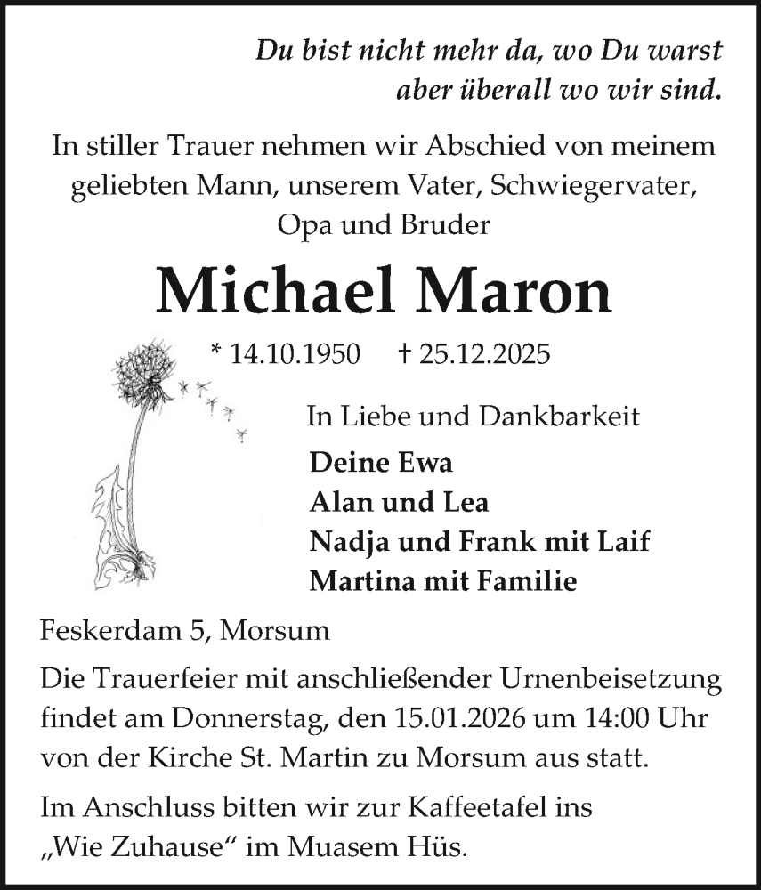 Hier finden Sie alle Traueranzeigen aus der Zeitung, die bisher für Michael Maron erschienen sind. Weitere Traueranzeigen, die in der Zeitung erscheinen, werden hier ebenfalls aufgelistet