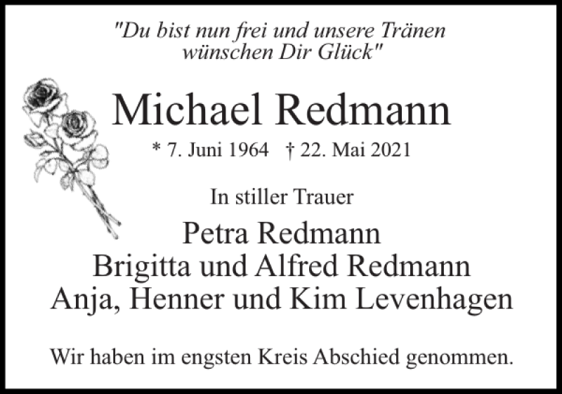 Hier finden Sie alle Traueranzeigen aus der Zeitung, die bisher für Michael Redmann erschienen sind. Weitere Traueranzeigen, die in der Zeitung erscheinen, werden hier ebenfalls aufgelistet