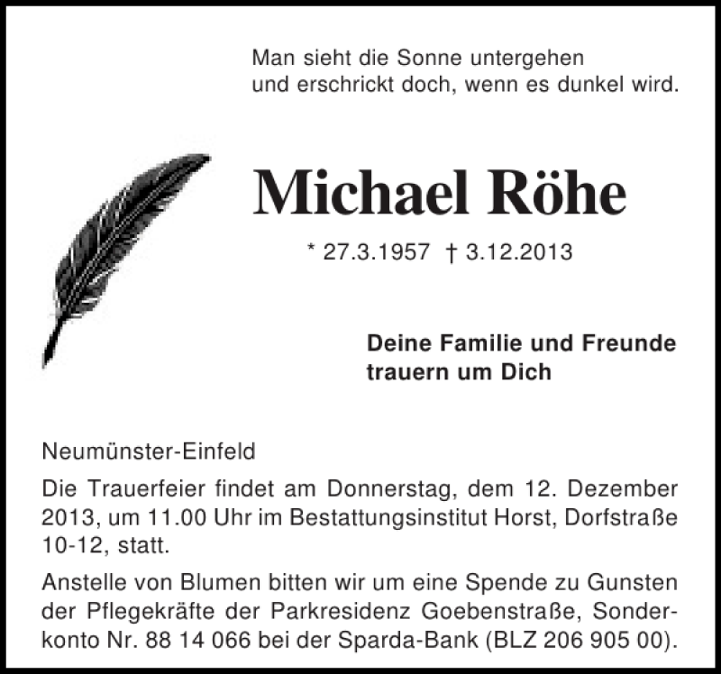 Hier finden Sie alle Traueranzeigen aus der Zeitung, die bisher für Michael Röhe erschienen sind. Weitere Traueranzeigen, die in der Zeitung erscheinen, werden hier ebenfalls aufgelistet