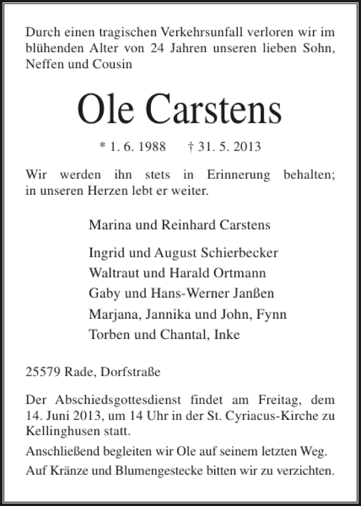 Hier finden Sie alle Traueranzeigen aus der Zeitung, die bisher für Ole Carstens erschienen sind. Weitere Traueranzeigen, die in der Zeitung erscheinen, werden hier ebenfalls aufgelistet