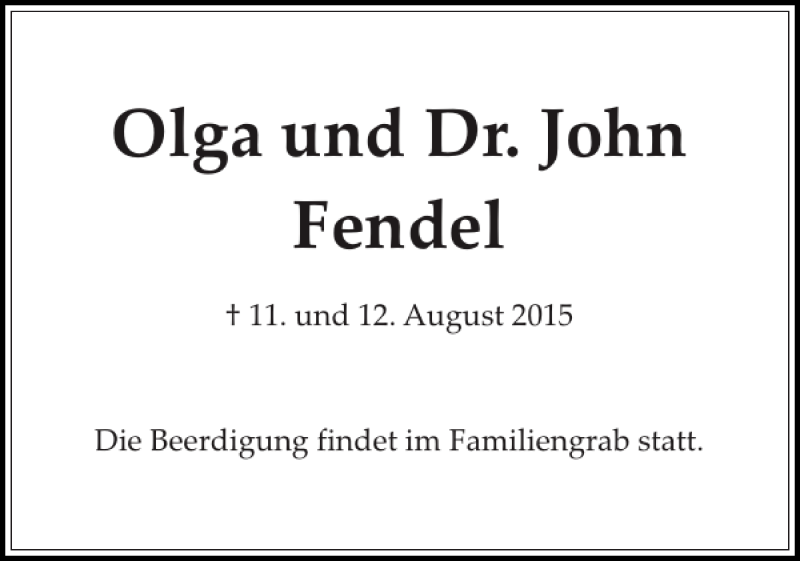 Hier finden Sie alle Traueranzeigen aus der Zeitung, die bisher für Olga und Dr. John Fendel erschienen sind. Weitere Traueranzeigen, die in der Zeitung erscheinen, werden hier ebenfalls aufgelistet