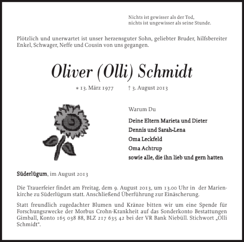Hier finden Sie alle Traueranzeigen aus der Zeitung, die bisher für Oliver Olli Schmidt erschienen sind. Weitere Traueranzeigen, die in der Zeitung erscheinen, werden hier ebenfalls aufgelistet