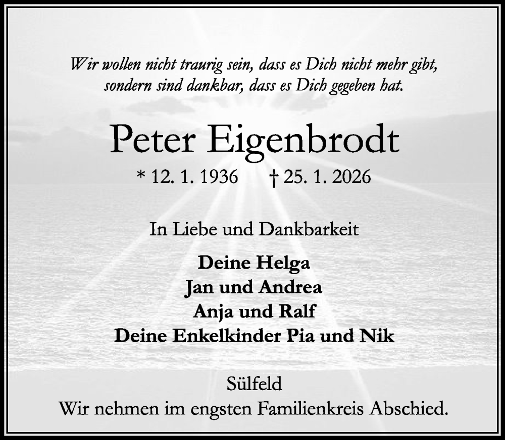 Hier finden Sie alle Traueranzeigen aus der Zeitung, die bisher für Peter Eigenbrodt erschienen sind. Weitere Traueranzeigen, die in der Zeitung erscheinen, werden hier ebenfalls aufgelistet