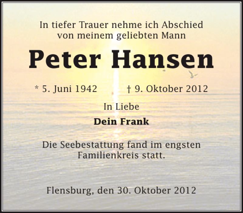 Hier finden Sie alle Traueranzeigen aus der Zeitung, die bisher für Peter Hansen erschienen sind. Weitere Traueranzeigen, die in der Zeitung erscheinen, werden hier ebenfalls aufgelistet