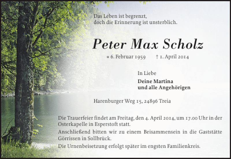Hier finden Sie alle Traueranzeigen aus der Zeitung, die bisher für Peter Max Scholz erschienen sind. Weitere Traueranzeigen, die in der Zeitung erscheinen, werden hier ebenfalls aufgelistet