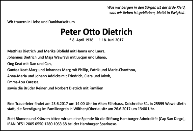 Hier finden Sie alle Traueranzeigen aus der Zeitung, die bisher für Peter Otto Dietrich erschienen sind. Weitere Traueranzeigen, die in der Zeitung erscheinen, werden hier ebenfalls aufgelistet