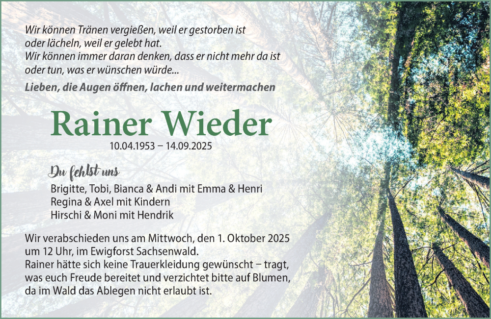 Hier finden Sie alle Traueranzeigen aus der Zeitung, die bisher für Rainer Wieder erschienen sind. Weitere Traueranzeigen, die in der Zeitung erscheinen, werden hier ebenfalls aufgelistet