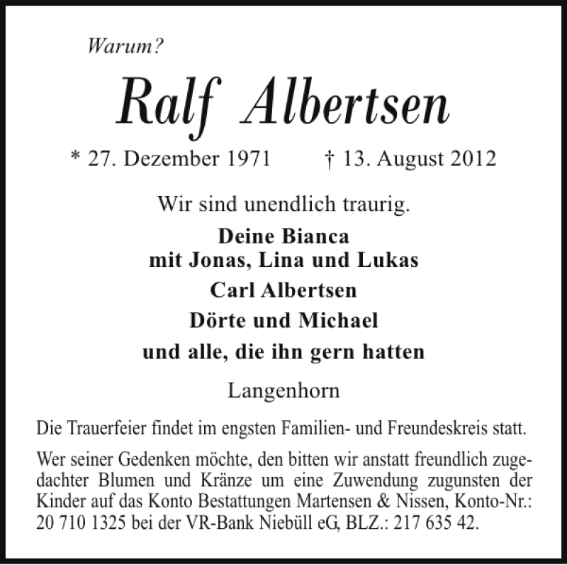 Hier finden Sie alle Traueranzeigen aus der Zeitung, die bisher für Ralf Albertsen erschienen sind. Weitere Traueranzeigen, die in der Zeitung erscheinen, werden hier ebenfalls aufgelistet