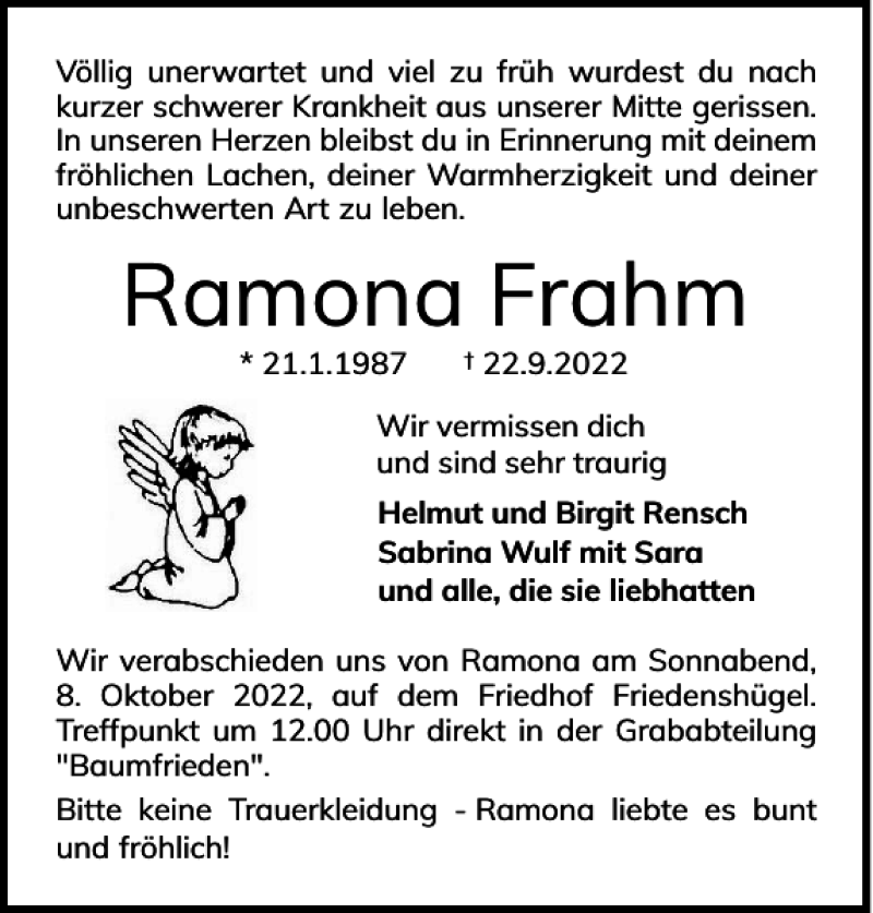 Hier finden Sie alle Traueranzeigen aus der Zeitung, die bisher für Ramona Frahm erschienen sind. Weitere Traueranzeigen, die in der Zeitung erscheinen, werden hier ebenfalls aufgelistet