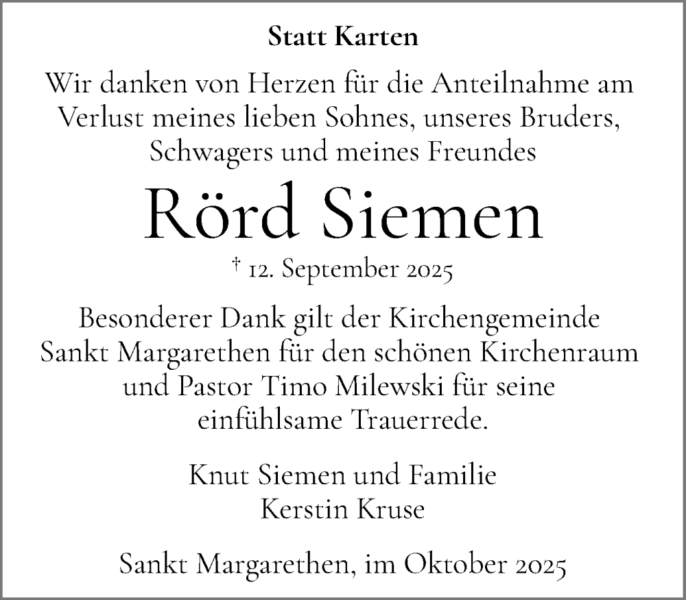 Hier finden Sie alle Traueranzeigen aus der Zeitung, die bisher für Rörd Siemen erschienen sind. Weitere Traueranzeigen, die in der Zeitung erscheinen, werden hier ebenfalls aufgelistet