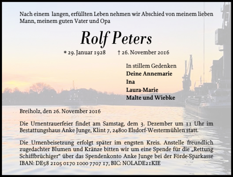 Hier finden Sie alle Traueranzeigen aus der Zeitung, die bisher für Rolf Peters erschienen sind. Weitere Traueranzeigen, die in der Zeitung erscheinen, werden hier ebenfalls aufgelistet