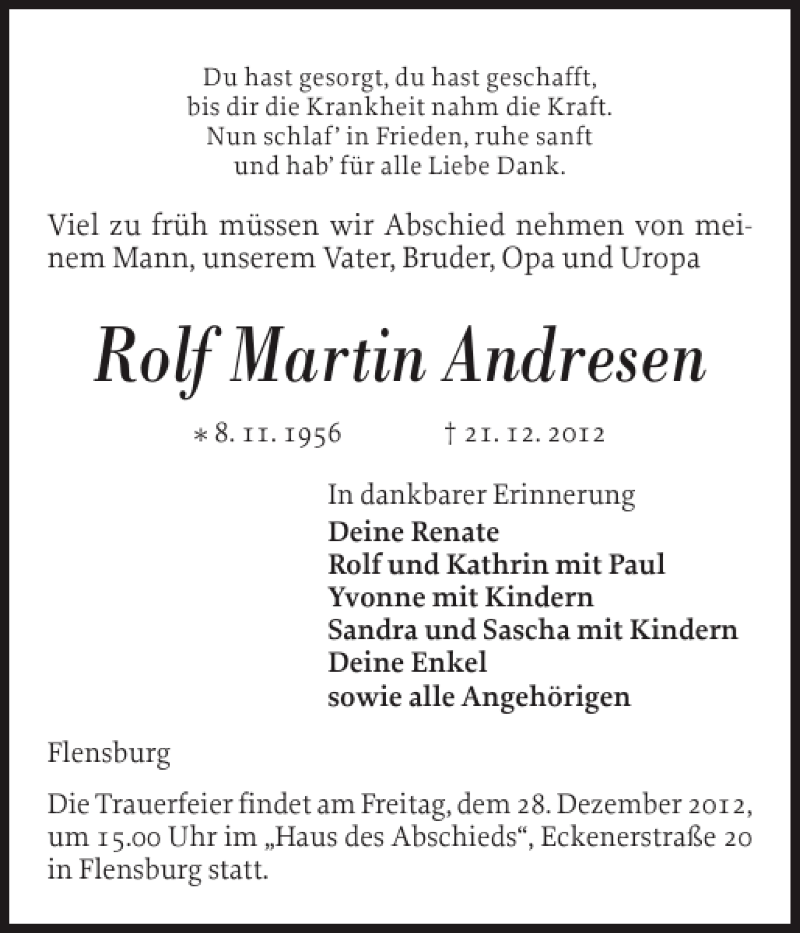 Hier finden Sie alle Traueranzeigen aus der Zeitung, die bisher für Rolf Martin Andresen erschienen sind. Weitere Traueranzeigen, die in der Zeitung erscheinen, werden hier ebenfalls aufgelistet