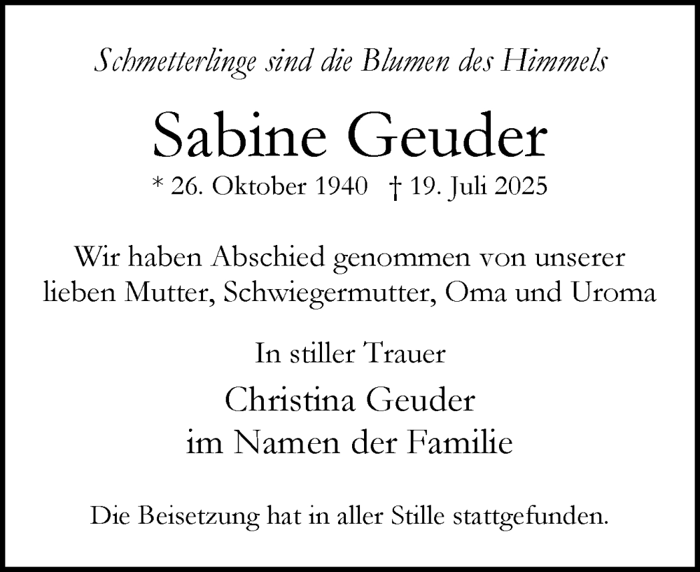 Hier finden Sie alle Traueranzeigen aus der Zeitung, die bisher für Sabine Geuder erschienen sind. Weitere Traueranzeigen, die in der Zeitung erscheinen, werden hier ebenfalls aufgelistet